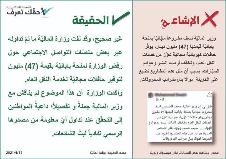 نبض البلد -نفت وزارة المالية ما تم تداوله عبر مواقع التواصل الاجتماعي حول رفضها منحة يابانية بقيمة 47 مليون دينار لتوفير حافلات مجانية لخدمة النقل العام.