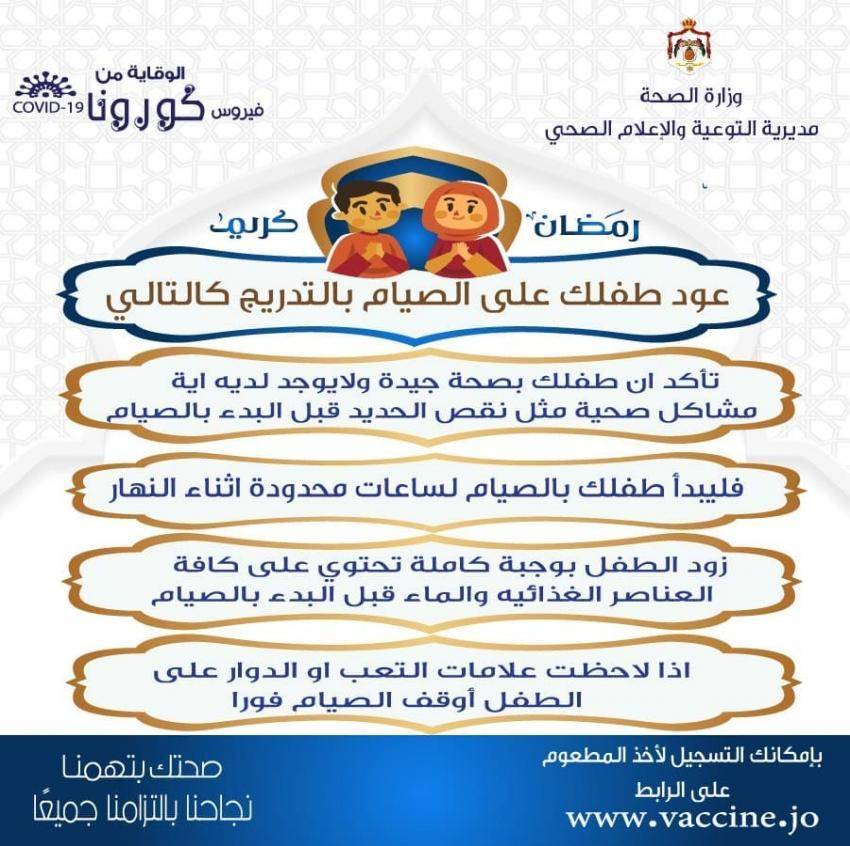 وقالت مديرية التوعية والاعلام الصحي في الوزارة عبر فيسبوك إنه يجب تعويد الأطفال على الصيام بالتدرج وذلك وفق التالي: