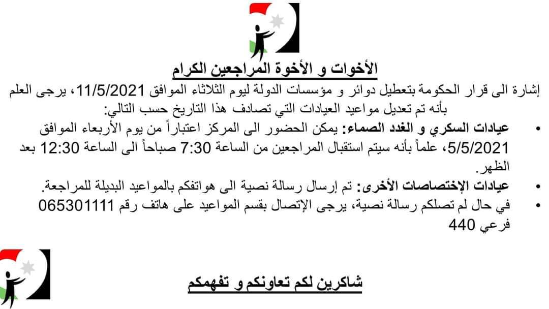 وأضاف المركز انه سيتم إرسال رسالة نصية للمراجعين بالمواعيد البديلة بالنسبة لعيادات الاختصاصات الأخرى، داعيا الى الإتصال بقسم المواعيد على هاتف رقم 065301111 فرعي 440 في حال لم تصل رسالة نصية.