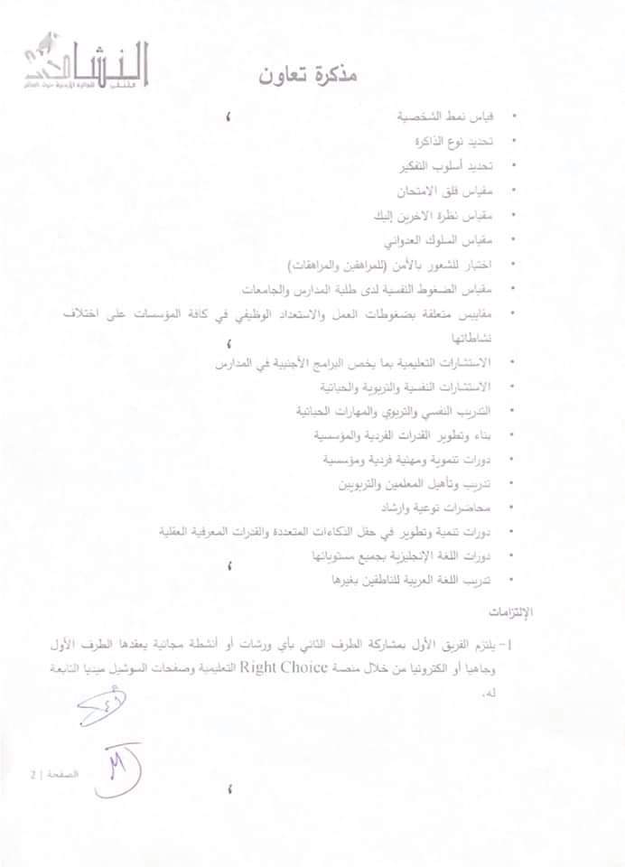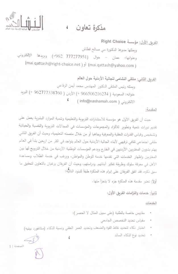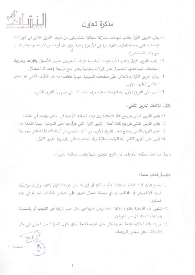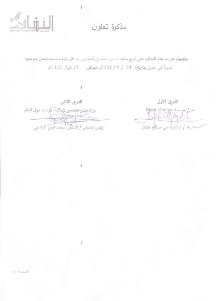 نبض البلد -تم بحمد الله اليوم الأثنين ٢٤ مايو ٢٠٢١م التوقيع على مذكرة تعاون بين ملتقى النشامى للجالية الاردنية حول العالم وبين مؤسسة Right Choice للإستشارات التربوية والتعليمية وتنمية الموارد البشرية يتم بموجبها تقديم كافة الاستشارات لأعضاء ملتقى النشامى مجانية (أنواع تلك الإستشارات موجودة في مذكرة التعاون في الصور) وكذلك عمل دورات وندوات أسبوعية مجانية مع الحصول على شهادة معتمدة لكل دورة تعقد وتقديم ٢٠ منحه دراسيه سنوياً للطلبة المتفوقين والفقراء. وسيعمل بهذه الاتفاقية إبتداءً من اليوم.