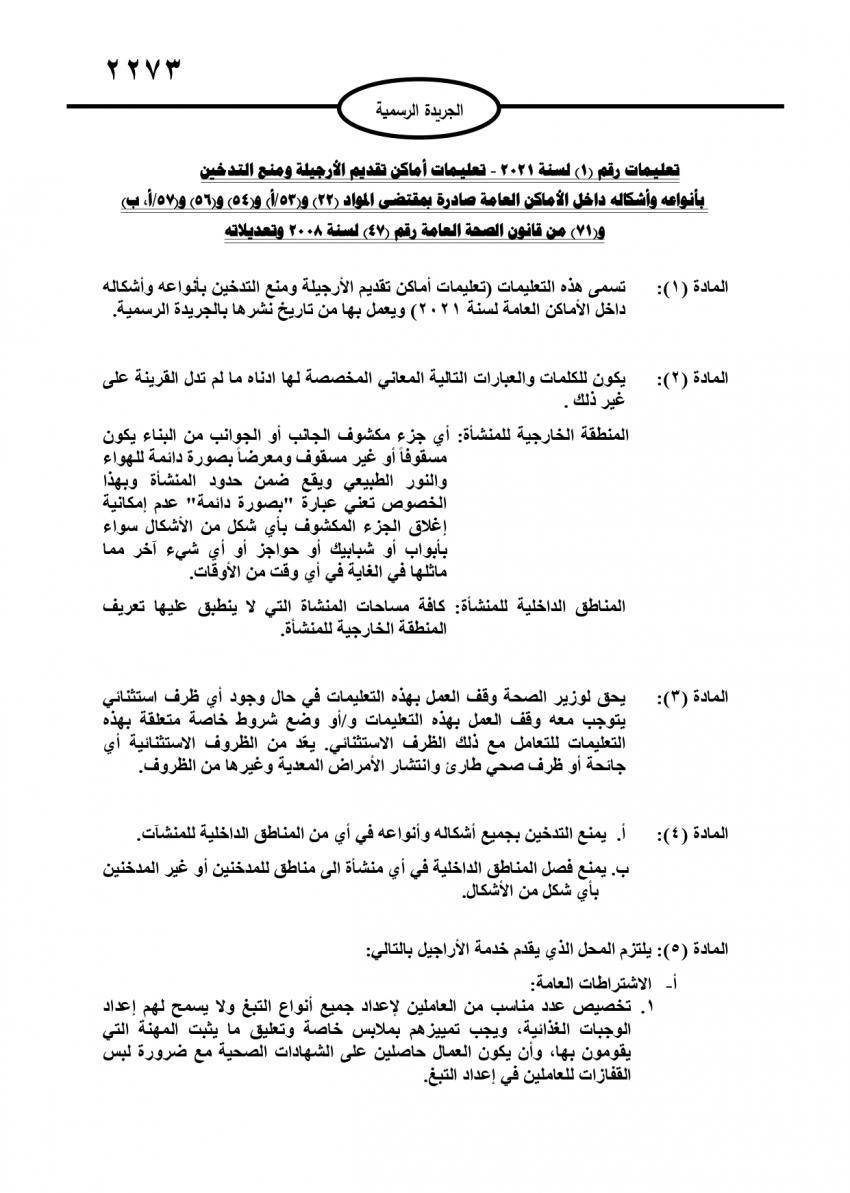 نبض البلد -صدر في عدد الجريدة الرسمية الاثنين، تعليمات أماكن تقديم الأرجيلة ومنع التدخين بأنواعه وأشكاله داخل الأماكن العامة.