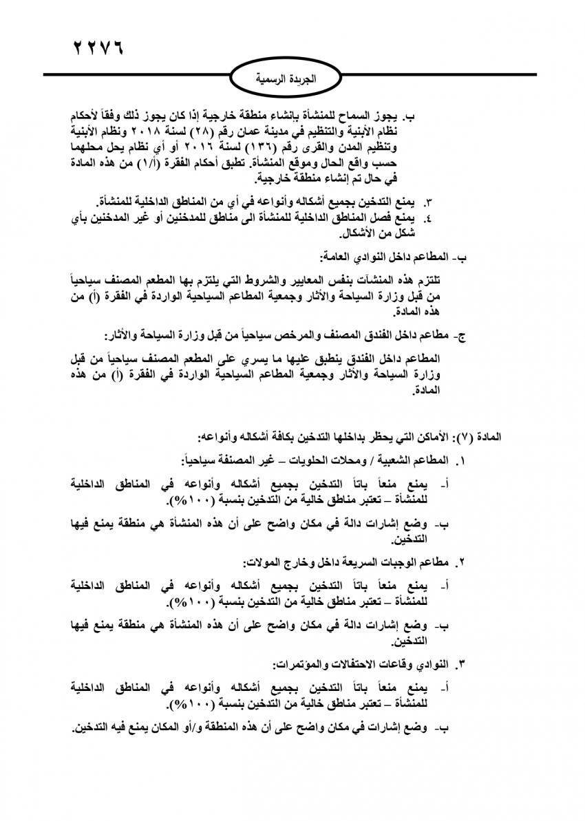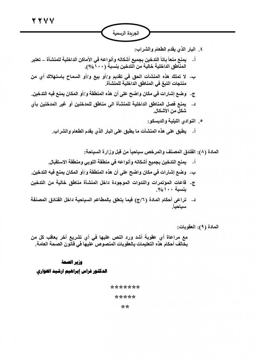 وبحسب التعليمات التي اصدرها وزير الصحة الدكتور فراس الهواري يمنع التدخين بجميع أشكاله وأنواعه في أي من المناطق الداخلية للمنشآت، كما يمنع فصل المناطق الداخلية في أي منشأة إلى مناطق للمدخنين أو غير المدخنين بأي شكل من الأشكال.