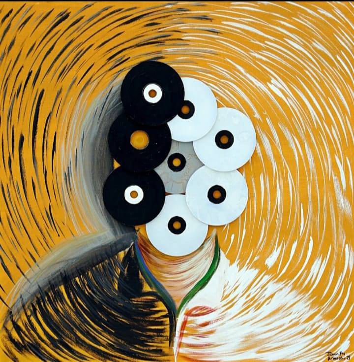 وحول اعادة التدوير للاقراص المدمجة في المعرض، اوضحت، "صحيح استخدمت الاقراص المدمجة (سي دي) في معرضي اولا لمواكبة تطورات العصر والحداثة وما بعدها باعمالي لكي اقدم شي جديد للجمهور، وكان عندي مجموعة سيديهات قديمة وشكلهم مدور بتوافق مع الدوائر اللي بحب استخدمها في اعمالي لمعرفتي عن قوة الشكل الدائري في الطاقة الإيجابية فحبيت استخدمهم بالفن، واستخدمت مجموعة منهم في عمل "لغة الالوان "،واخرى "لزقتهم" على الاعمال على حسب الحرف اللي بحمله كل لون بالرجوع طبعا لجدول لغة الالوان حتى يستطيع من ينظر للوحة الحصول على معنى مفهوم من خلال الالوان فقط، والمجموعة الثالثة استخدمتها بالديكور والازياء، واخترت المودل لجين الجعبة لارتداء الجاكيت اللي عليه السيديهات.