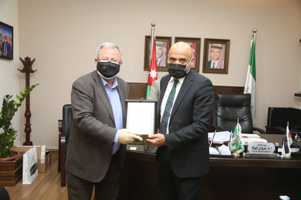 والتقى المولا في مكتبه وفد السفارة العُمانية الذي ضم البلوشي والسنيدي ورئيس القسم الأكاديمي الدكتور عبد الله مشعل عبيدات، كرم خلاله الملحق الثقافي السابق بحضور عميد القبول والتسجيل ومدير العلاقات العامة والدولية في الجامعة.