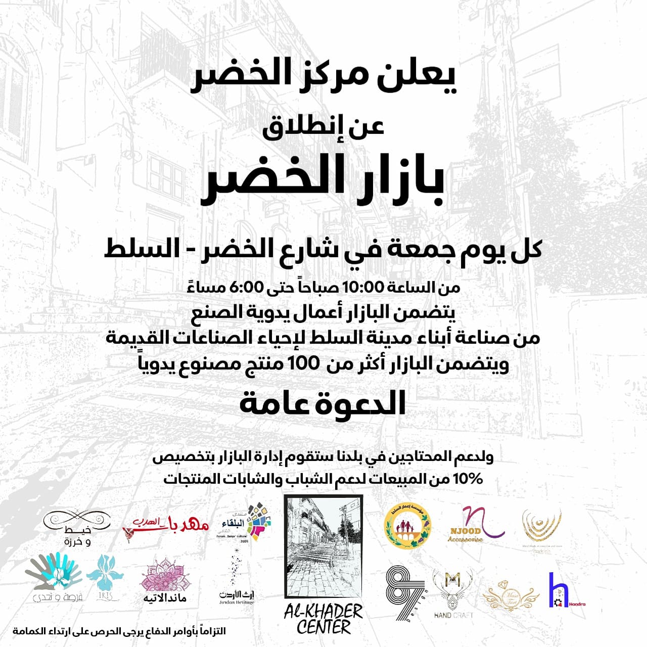 نبض البلد -مركز الخضر يطلق بازار الخضر بمنتجات من صناعة ابناء مدينة السلط كل جمعة في شارع الخضر السلط من الساعة ١٠ صباحاً وحتى ٦ مساءً