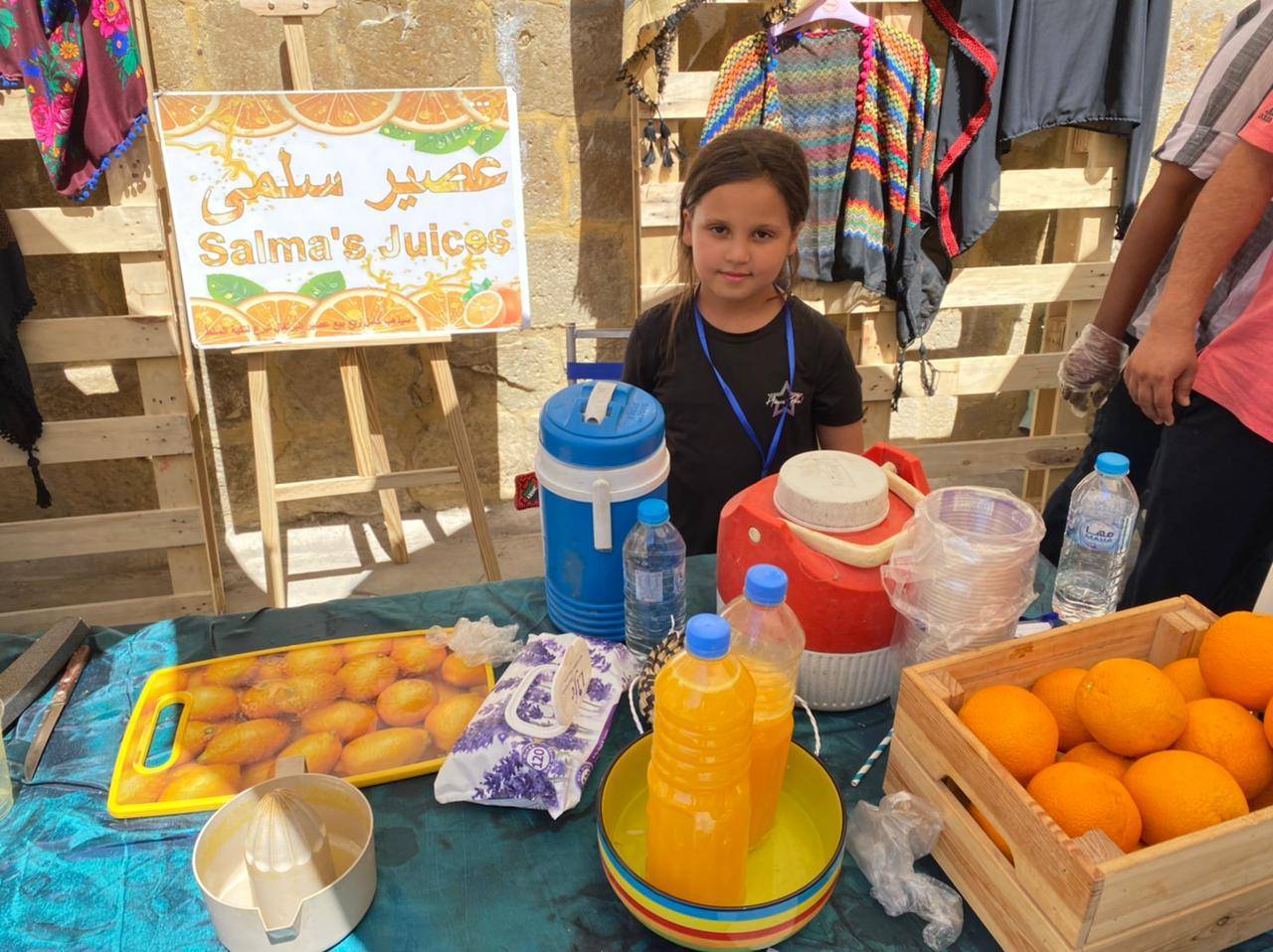 وبالحديث مع أصغر مشتركة بالبازار الطفله سلمى التي تبلغ بالعمر ٦ سنوات التي تقوم ببيع العصير الطبيعي بالبازار وتتبرع بالمردود المادي الذي يعود عليها من بيع العصير إلى مُبادرة تكيّة السلط التي تقدم الأكل للعائلات الميسور حالها