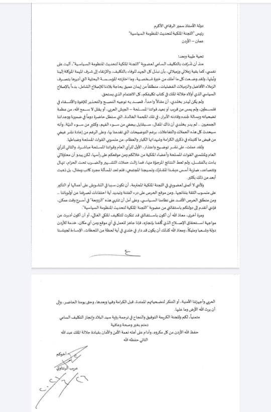 عريب الرنتاوي يستقيل من اللجنة الملكية لتحديث المنظومة السياسية - نصّ الاستقالة