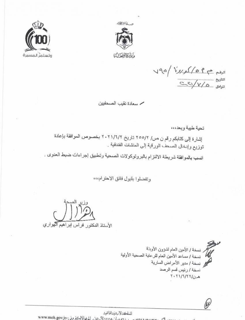 واشترط الهواري في كتاب موجه للقائم بأعمال نقيب الصحفيين الأردنيين الزميل ينال البرماوي أن يتم الالتزام بالبروتوكولات الصحية وتطبيق اجراءات ضبط العدوى.