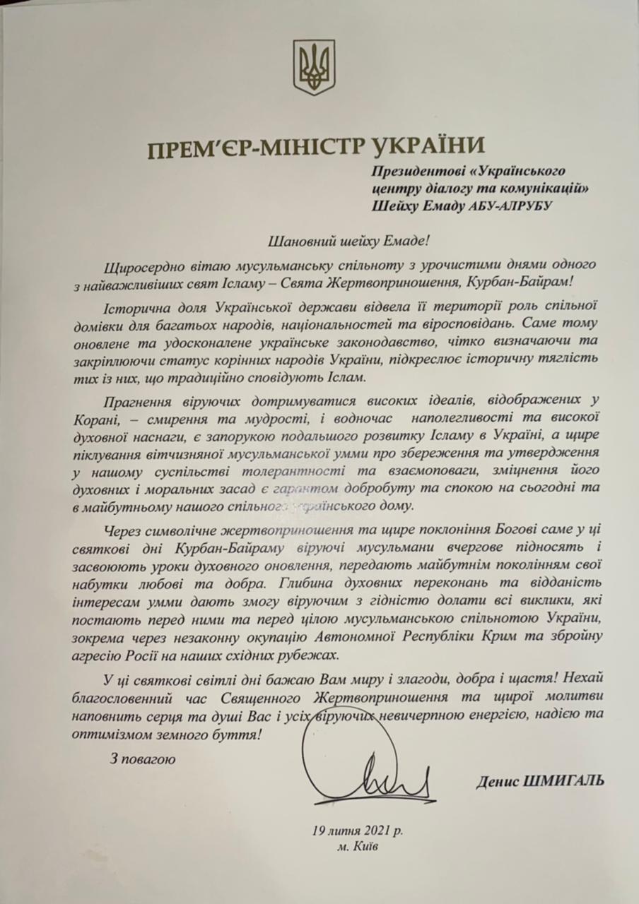 وقال شميجال أنه يهنئ المجتمع المسلم بصدق في الأيام الجليلة لواحد من أهم أعياد الإسلام - عيد النحر ، عيد الأضحى مشيرا أن هذا العيد يعطي  المصير التاريخي للدولة الأوكرانية أراضيها دور البيت المشترك للعديد من الشعوب والجنسيات والأديان مضيفا أن هذا هو السبب في أن التشريع الأوكراني المُحدّث والمُحَسّن ، الذي يحدد بوضوح ويعزز وضع الشعوب الأصلية في أوكرانيا ، يؤكد على طول العمر التاريخي لمن يعتنقون الإسلام تقليديًا.