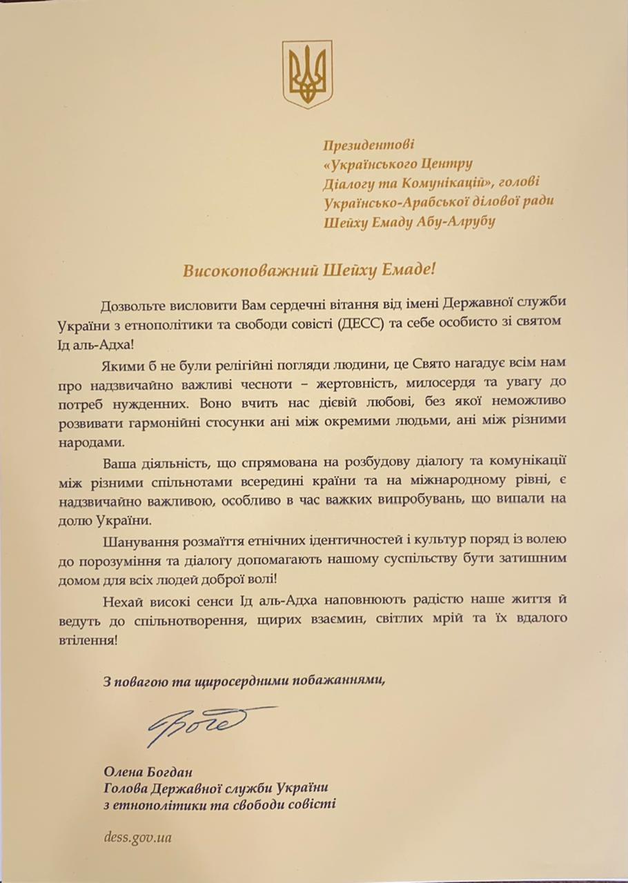 كما  هنأت  رئيسة دائرة الدولة في اوكرانيا للسياسات العرقية وحرية الضمير  اولينا بوهدان    الشيخ عماد أبو الرب بمناسبة حلول عيد الاضحى المبارك .