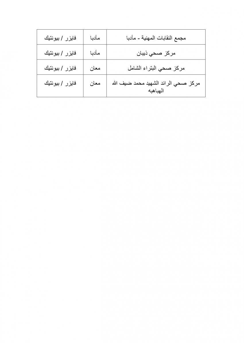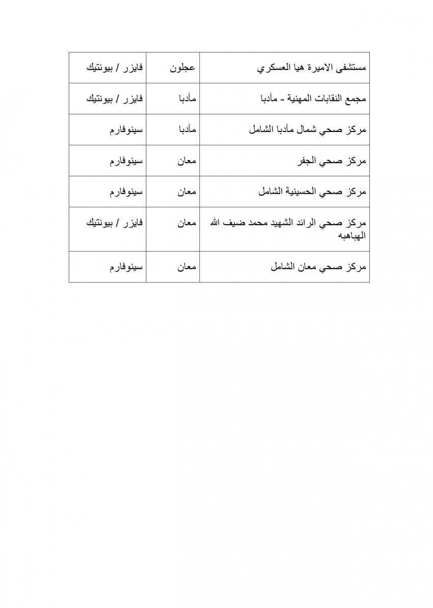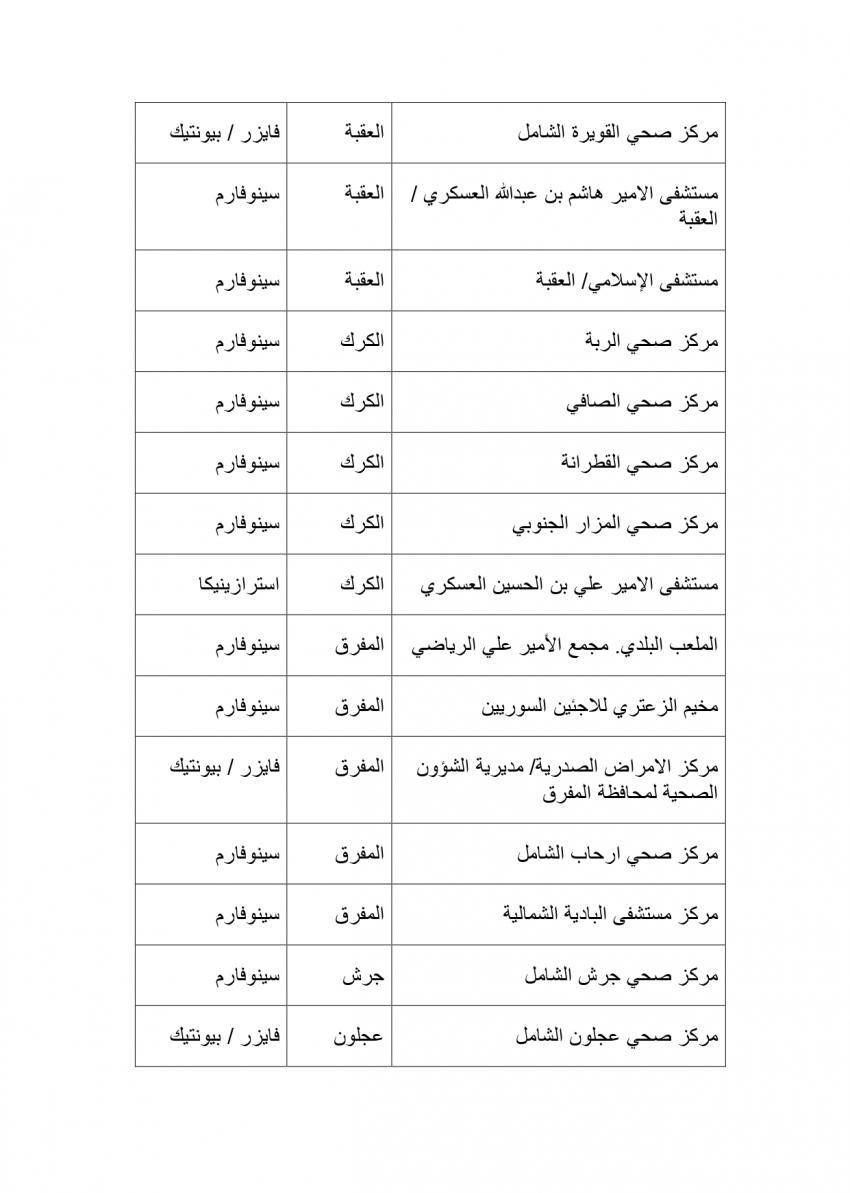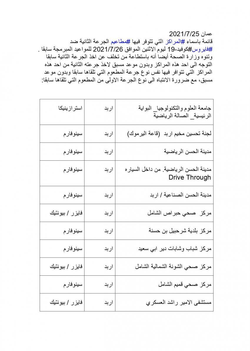 وتنوه وزارة الصحة أيضا أنه باستطاعة من تخلف عن اخذ الجرعة الثانية سابقا التوجه الى احد هذه المراكز وبدون موعد مسبق لاخذ جرعته الثانية من احد هذه المراكز التي تتوافر فيها نفس نوع جرعة المطعوم التي تلقاها سابقا وبدون موعد مسبق، مع ضرورة الانتباه الى نوع الجرعة الاولى من المطعوم التي تلقاها سابقا.