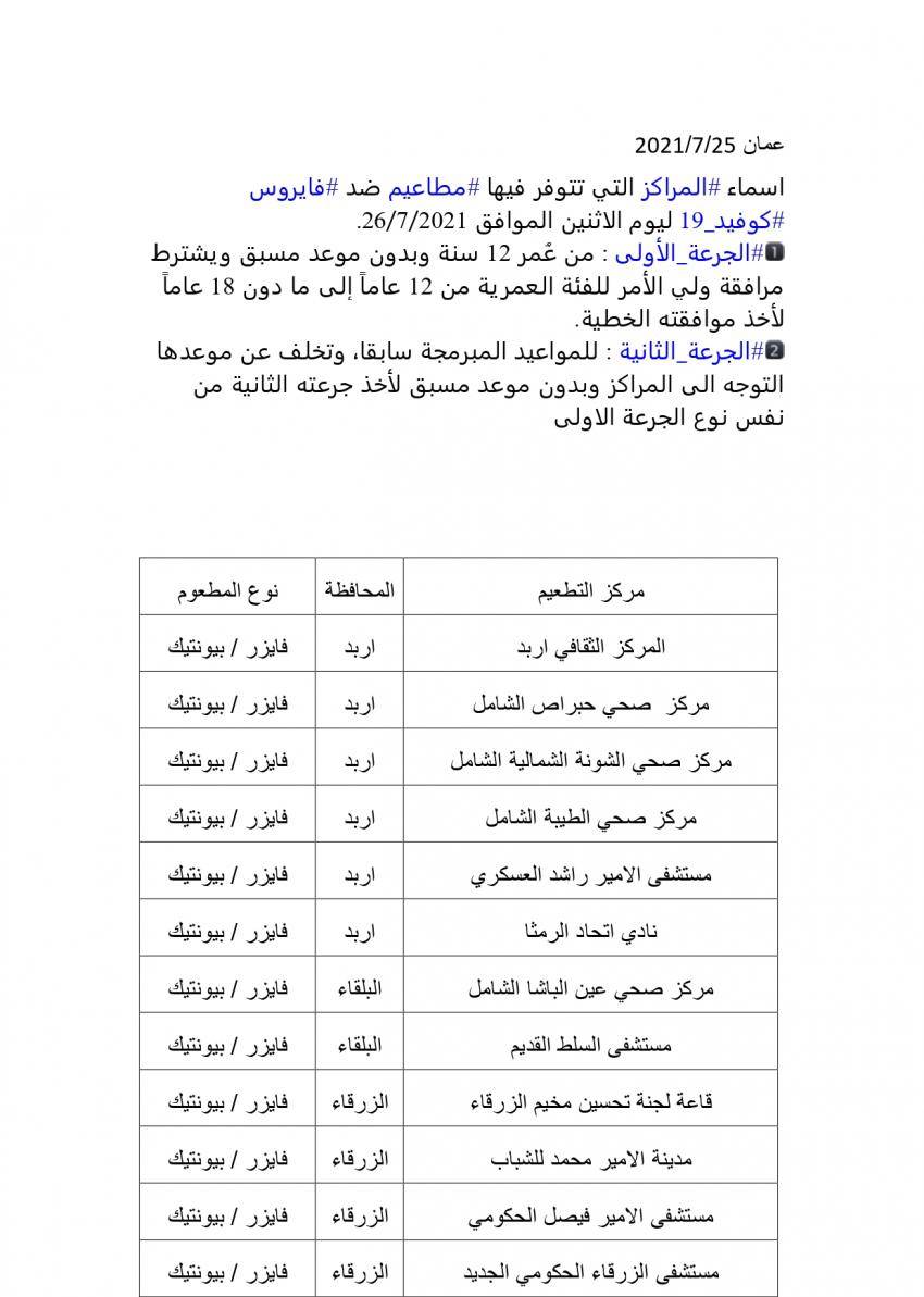 أعلنت وزارة الصحة قائمة باسماء المراكز التي تتوفر فيها مطعوم فايزر الجرعة الاولى ضد فيروس كورونا وذلك ليوم الاثنين، للأعمار من 12 عاماً فما فوق، وبدون موعد مسبق.