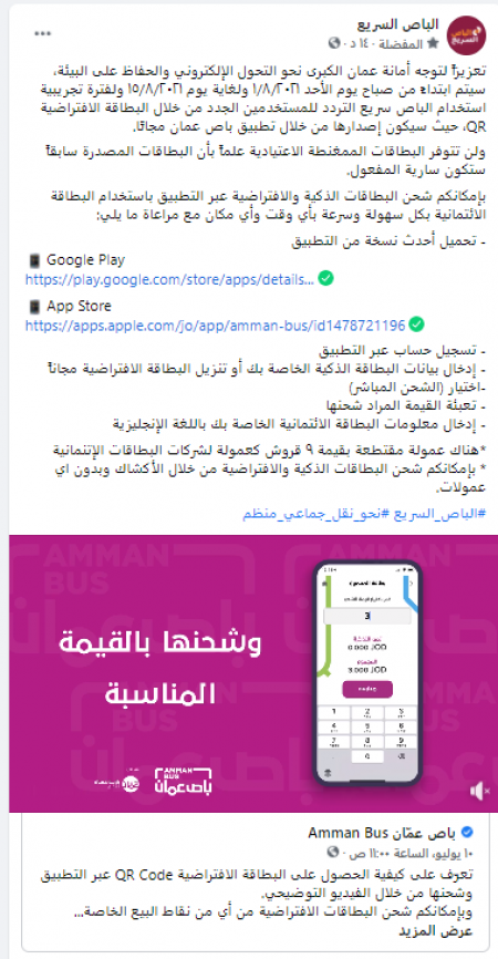 وقالت الأمانة في ادراج لها على فيسبوك إنه سيكون إصدار البطاقة الافتراضية من خلال تطبيق باص عمان مجانًا، مشيرة إلى أن البطاقات المصدرة سابقاً ستكون سارية المفعول.