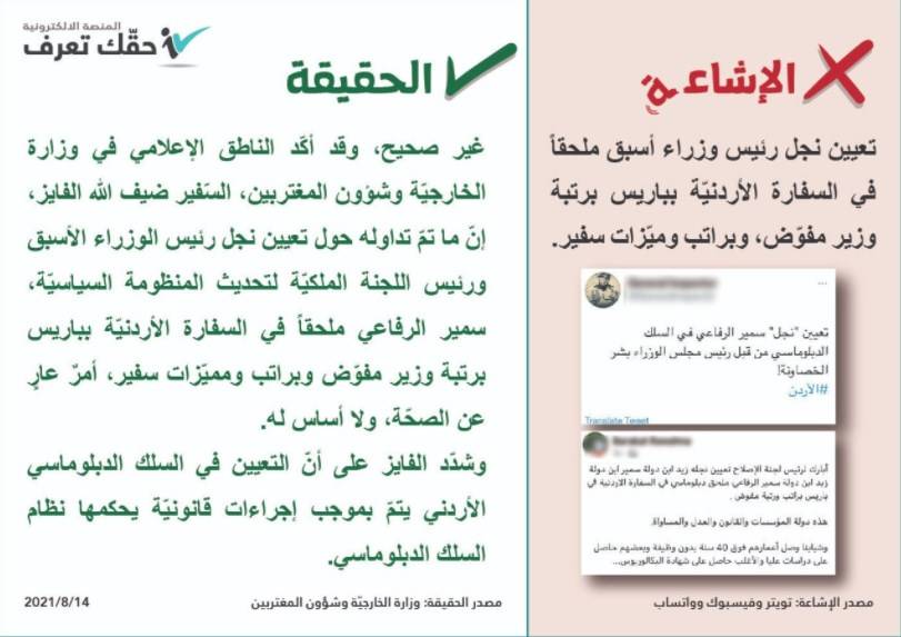 بينت الحكومة عبر منصة حقك تعرف انه لا صحّة لتعيين نجل رئيس الوزراء الأسبق سمير الرفاعي ملحقاً في السفارة الأردنيّة بباريس.