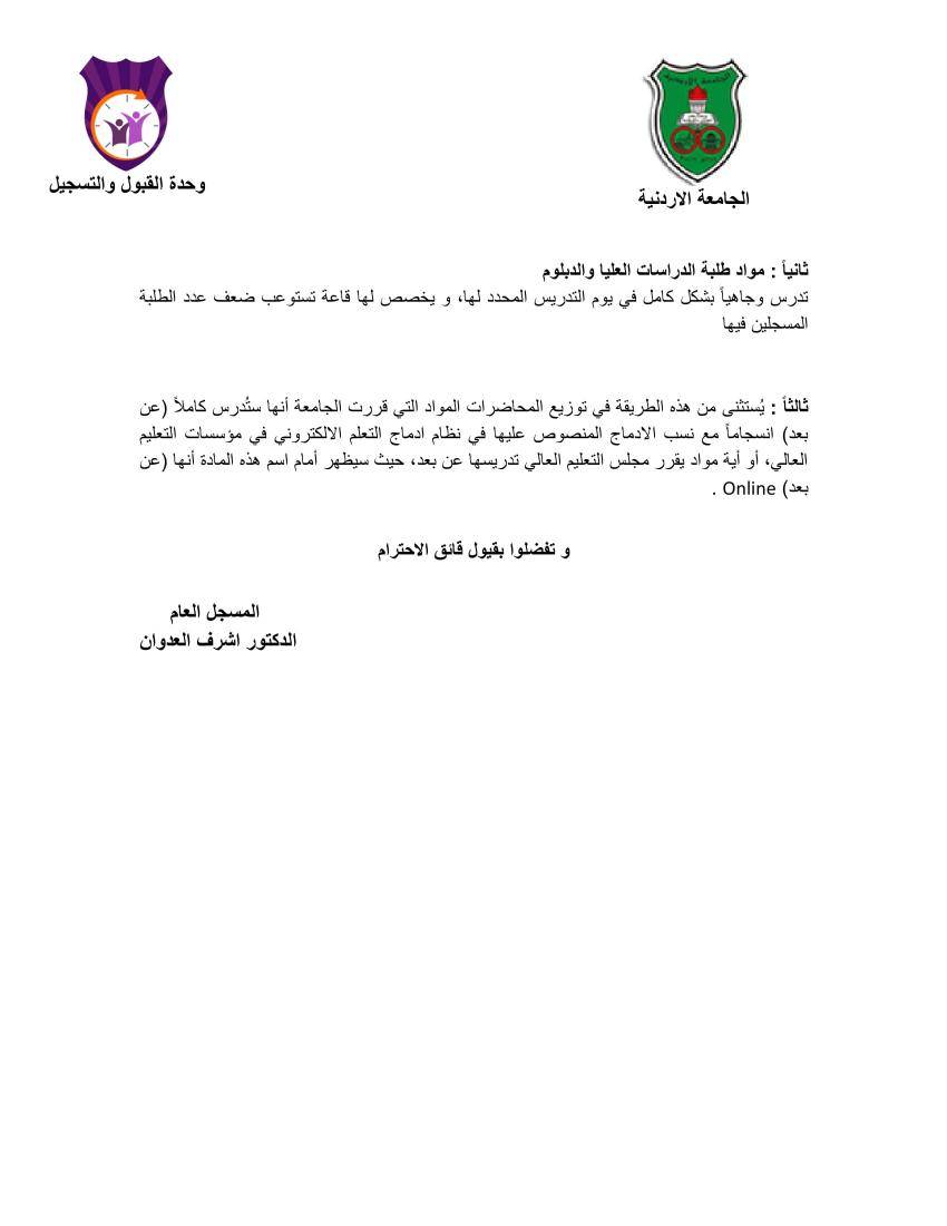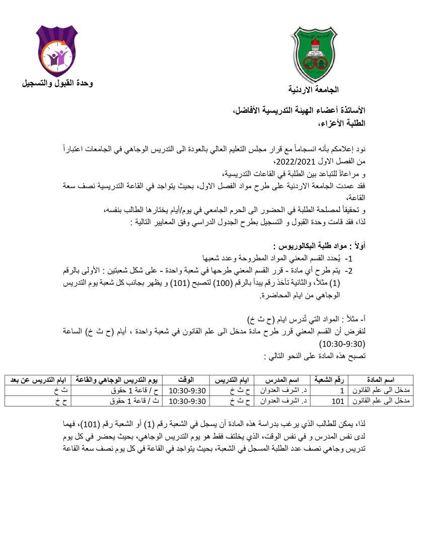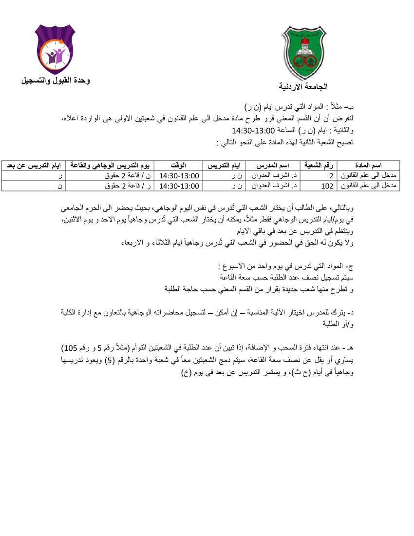 وقال إنه تحقيقاً لمصلحة الطلبة في الحضور الى الحرم الجامعي في يوم/أيام يختارها الطالب بنفسه، قامت وحدة القبول والتسجيل بطرح الجدول الدراسي وفق المعايير التالية:​