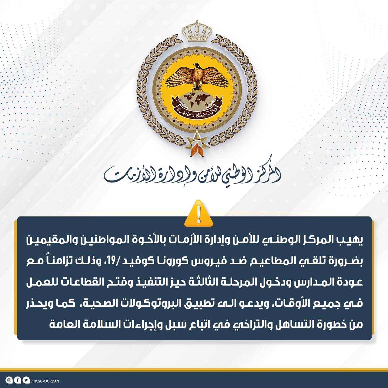 وأهاب المركز بالمواطنين والمقيمين بضرورة تلقي المطاعيم ضد فيروس كورونا، وذلك تزامنا مع عودة المدارس ودخول المرحلة الثالثة من فتح القطاعات حيز التنفيذ والسماح لها بالعمل في جميع الأوقات.