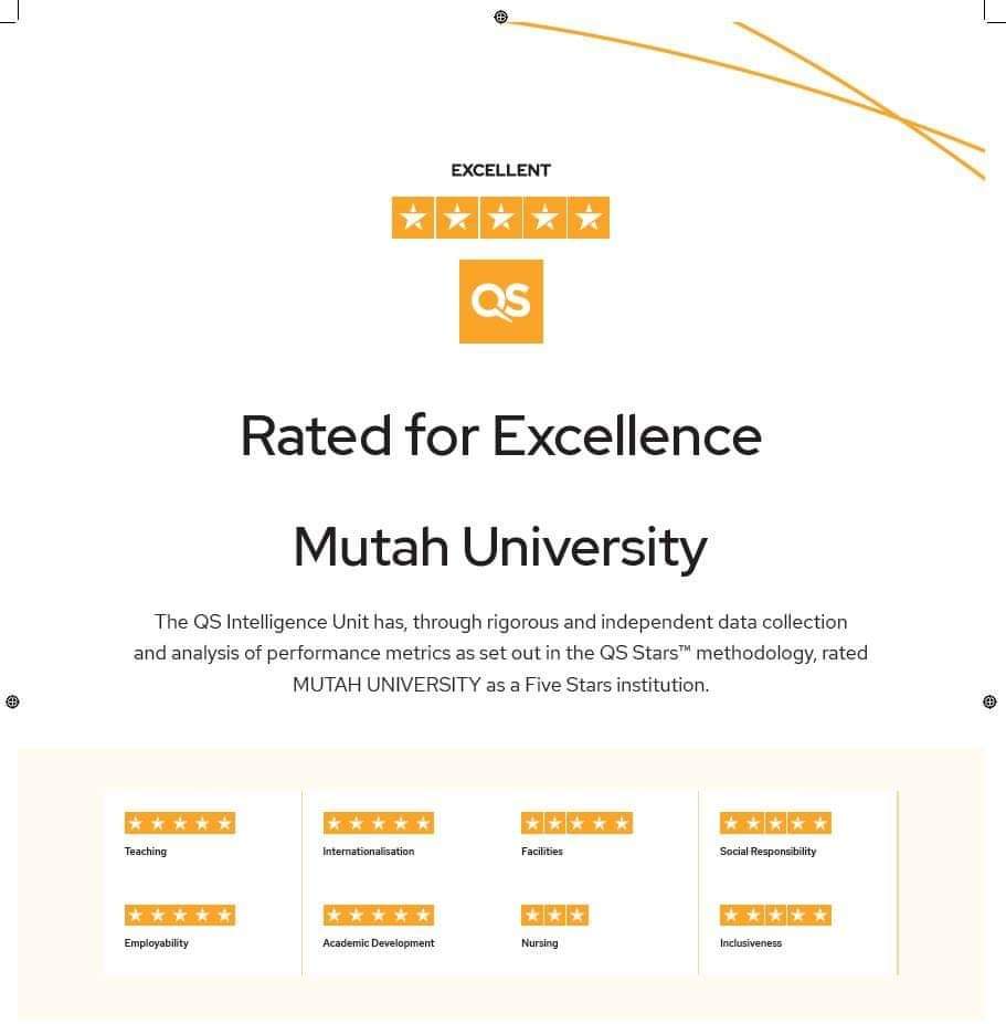 حققت جامعة مؤتة أنجازا تاريخيا بتقدمها الى فئة الخمس نجوم في تقييم (QS STARS) العالمي وفقا لمؤسسة QS البريطانية التي تعد إحدى أكبر ثلاث جهات تعنى بتصنيف الجامعات على مستوى العالم من حيث الاهمية والتأثير وتعد هذه ارفع شهادة في مجال جودة التعليم العالي تحصل عليها جامعة مؤتة منذ تأسيسها وبذلك تكون ثالث جامعة أردنية تحصد هذا الموقع المتميز