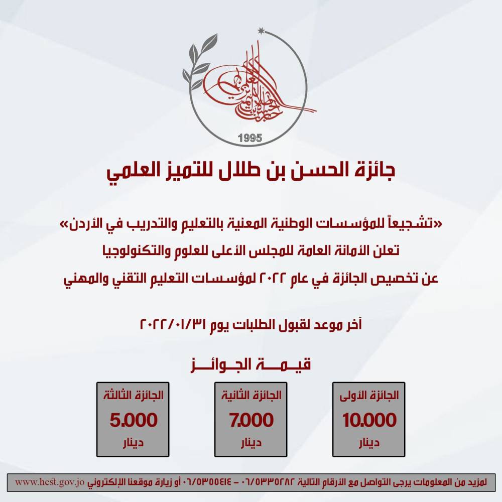 تعلن الأمانة العامة للمجلس الأعلى للعلوم والتكنولوجيا عن تخصيص جائزة الحسن بن طلال للتميّز العلمي للعام 2022 لمؤسسات التعليم المهني والتقني، هذا وقد أنشأ المجلس الأعلى في عام 1995 هذه الجائزة تكريماً لمكانة سمو الأمير الحسن بن طلال المعظم- رئيس المجلس الأعلى للعلوم والتكنولوجيا- في دعم العلم والعلماء والتميز والإبداع وتشجيعاً للمؤسسات المعنية بالتعليم والتدريب، وترأس لجنة الجائزة سمو الأميرة ثروت الحسن المعظمة التي أقرت مجموعة من الأسس والمعايير ولتقييم المشروعات المتنافسة، أهمها: التميز، وخدمة المجتمع، وأن يكون المشروع محدد ويقدم بصفة جماعية ومؤسسية، وغيرها (مرفق)