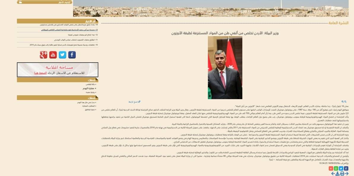 عام 2021م : أوضح أمين عام وزارة البيئة، الدكتور محمد الخشاشنة أن المصانع والشركات الأردنية استجابت عام 2016 لمتطلبات المرحلة الثانية من تطبيق بروتوكول مونتريال!!