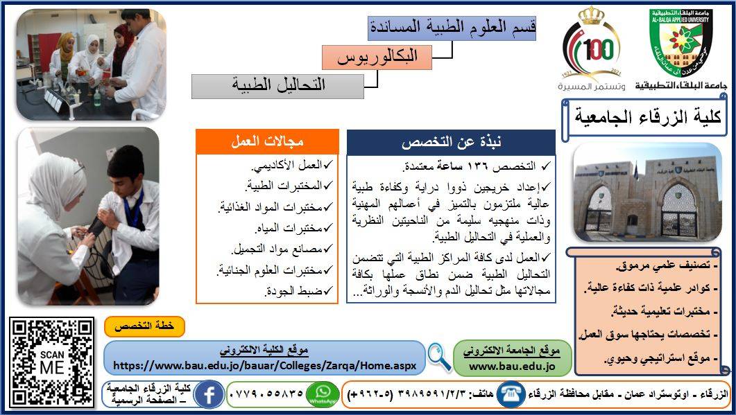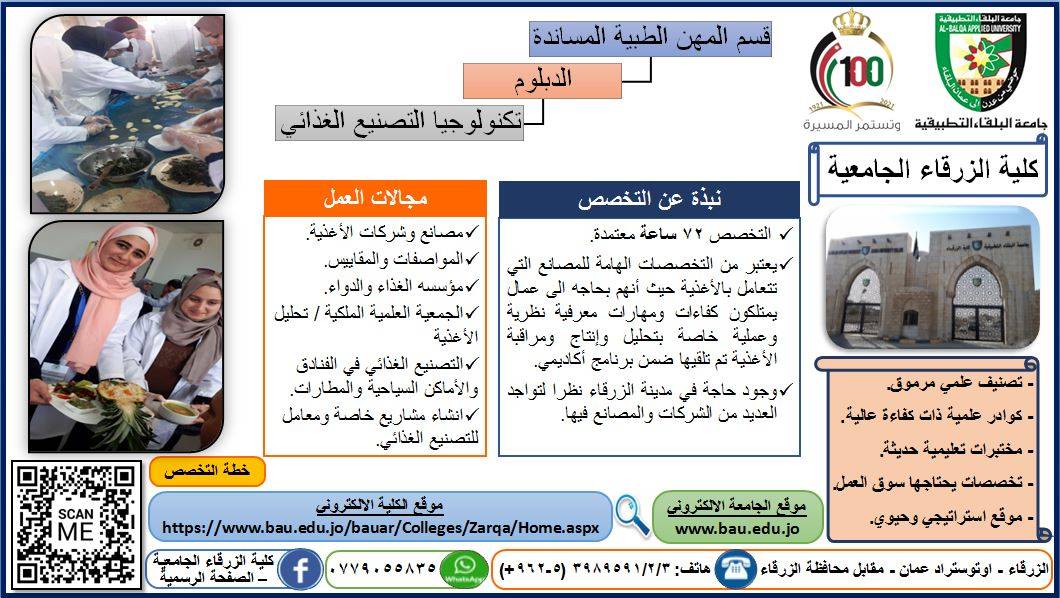 نبض البلد -قامت كلية الزرقاء الجامعية بالعمل ولأول مرة على إضافة المعلومات الخاصة بالتخصصات التي توفرها الكلية ومجالات العمل لكل تخصص ، لتتيح للمواطن المعلومات التي تساعده في اختيار التخصص الذي يناسبه وذلك على تطبيقات وسائل التواصل الاجتماعي المختلفة بالإضافة الى أنه تم استخدام تقنية (QR Code) وذلك لتسهيل الوصول لكل من الموقع الالكتروني الخاص بالكلية ، والرابط الالكتروني الخاص بالخطة الدراسية لكل تخصص بشكل منفرد، كما أنه تم تحديد رقم هاتف (0779055835) بالإضافة الى رقم هاتف الكلية الأرضي لغايات التسهيل والرد على استفسارات المراجعين المتعلقة بالتخصصات والدورات المتاحة داخل الكلية من خلال رئيس قسم الاستشارات والتدريب وخدمة المجتمع المحلي "زيد عمر الحياصات" ، ورئيس قسم العلاقات العامة والإعلام "مها عبدالله الحجاج" ، والذين قاموا بتصميم وتنفيذ المعلومات والبيانات كما هو مدون بوسائل التواصل الاجتماعي المختلفة.