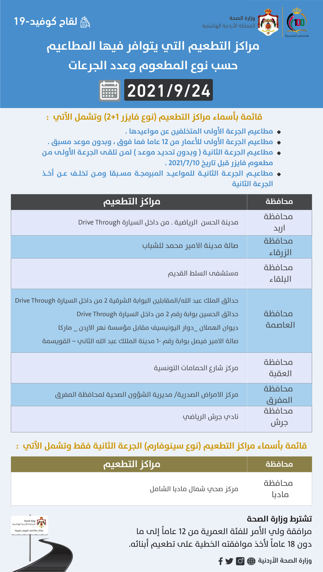 أعلنت وزارة الصحة عن قائمة بمراكز التطعيم التي يتوافر فيها المطاعيم حسب نوع المطعوم وعدد الجرعات ليوم الجمعة 2021/9/24، وبدون موعد مسبق.