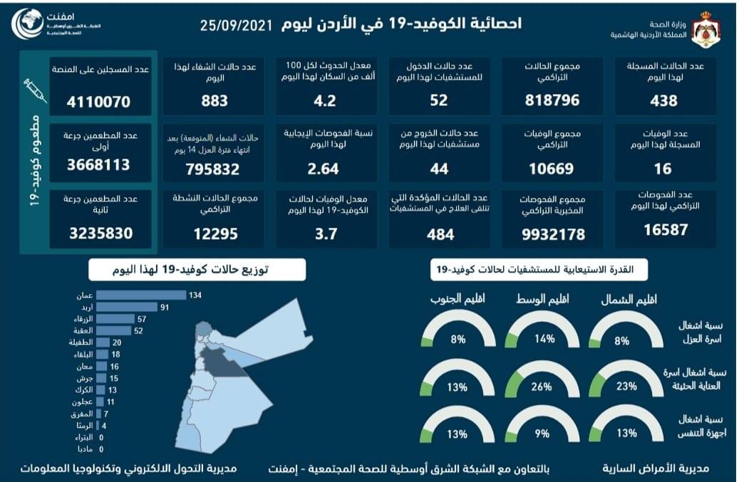الصحة: 16 وفاة و438 إصابة كورونا جديدة في الأردن