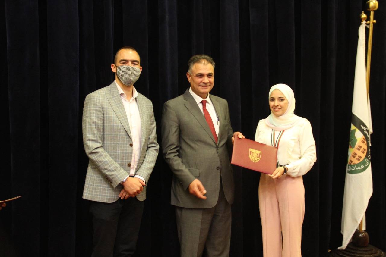 وعبر الاستاذ الدكتور رئيس الجامعة عن فخره واعتزازه بالمستوى المتميز الذي وصل اليه اعضاء الهيئة التدريسية وطلبة الجامعة وبالمشاريع الريادية المقدمة من الطلبة مشيرا الى ان الجامعة تدعم كافة الافكار الابداعية للطلبة وتوفر كافة الامكانات لهم من نقل تكنولوجيا وتدريب ومهارات وتأهيل بتمكن طلبة الجامعة من الالتحاق بسوق العمل من خلال ما تمتلكه الجامعة من شبكة علاقات مع شركائنا الدوليين، مؤكدا ان طلبة الجامعة هم عند حسن ظن جلالة الملك عبدالله الثاني المعظم وولي العهد ويحققون الرؤى الملكية والتي تولي الشباب جل اهتمامها وهم عماد مستقبل الأردن الواعد.