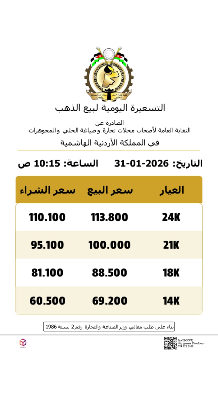 وحسب النشرة التي أصدرتها النقابة العامة لأصحاب محلات تجارة وصياغة الحلي والمجوهرات، بلغ سعر الغرام الواحد من الذهب عيارات 24 و18 و 14 لغايات البيع من محلات الصاغة عند 117.30 و 91.20 و 71.30 دينارا على التوالي.