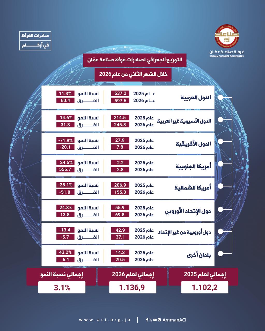 وحسب التوزيع الجغرافي لصادرات الغرفة خلال الشهرين الماضيين من العام الحالي، جاءت الدول العربية بالمقدمة بقيمة نحو 598 مليون دينار، والدول الآسيوية غير العربية 246 مليون دينار والدول الإفريقية نحو 8 ملايين دينار.