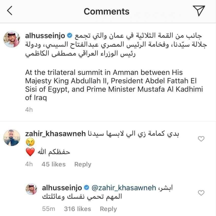 وكان الشاب قد علق على صورة نشرها سمو ولي العهد من القمة الثلاثية "بدي كمامة زي الي لابسها سيدنا، حفظكم الله"، ليرد سموه "ابشر، المهم تحمي نفسك وعائلتك".