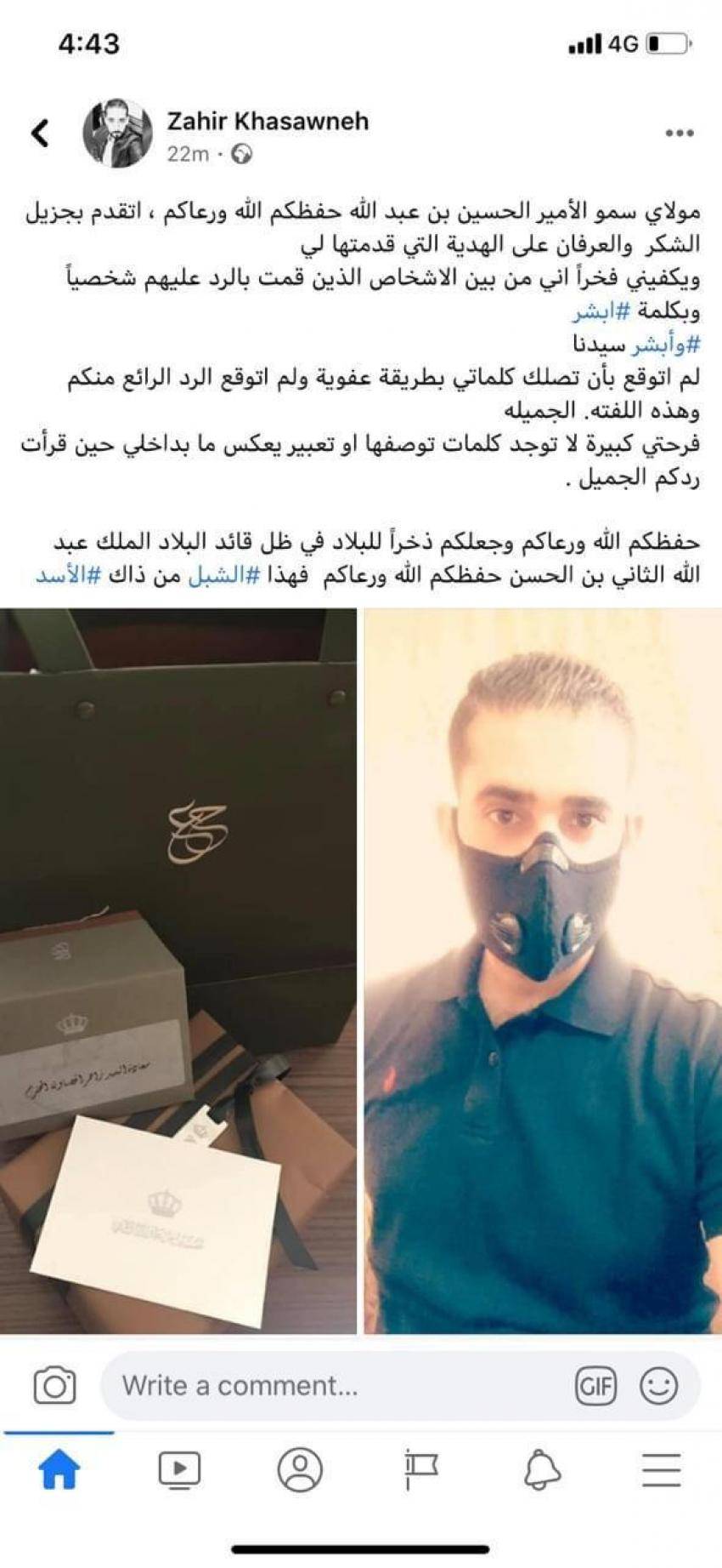 وقال الشاب الخصاونة الذي قام بنشر صورة له وهو يرتدي الكمامة وصورة للهدية التي وصلته "مولاي سمو الأمير الحسين بن عبدالله حفظكم الله ورعاكم، اتقدم بجزيل الشكر والعرفان على الهدية التي قدمتها لي ويكفيني فخراً اني من بين الاشخاص الذين قمت بالرد عليهم شخصياً وبكلمة ابشر".