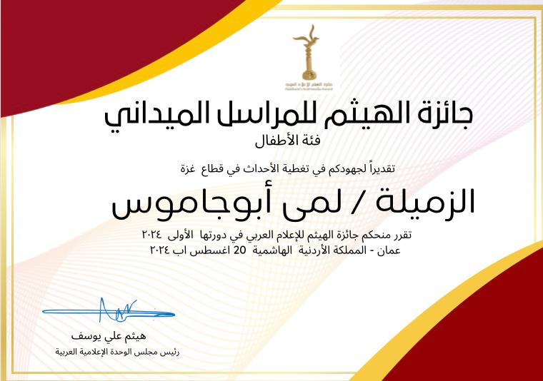 يذكر ان هذه جائزة الهيثم للمراسل الميداني احدى مبادرات مجلس الوحدة الإعلامية العربية وأكاديمية كواليس لاعلام الأطفال