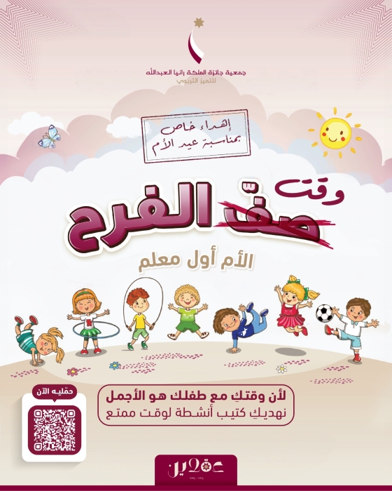 بمناسبة عيد الأم، تهدي جمعية جائزة الملكة رانيا العبدالله للتميّز التربوي لكل أم دليل برنامج صف الفرح، ليكون مساحة دافئة تقضين فيها وقتاً نوعياً مع طفلك، من خلال أنشطة تربوية بسيطة أعدّها مختصون.