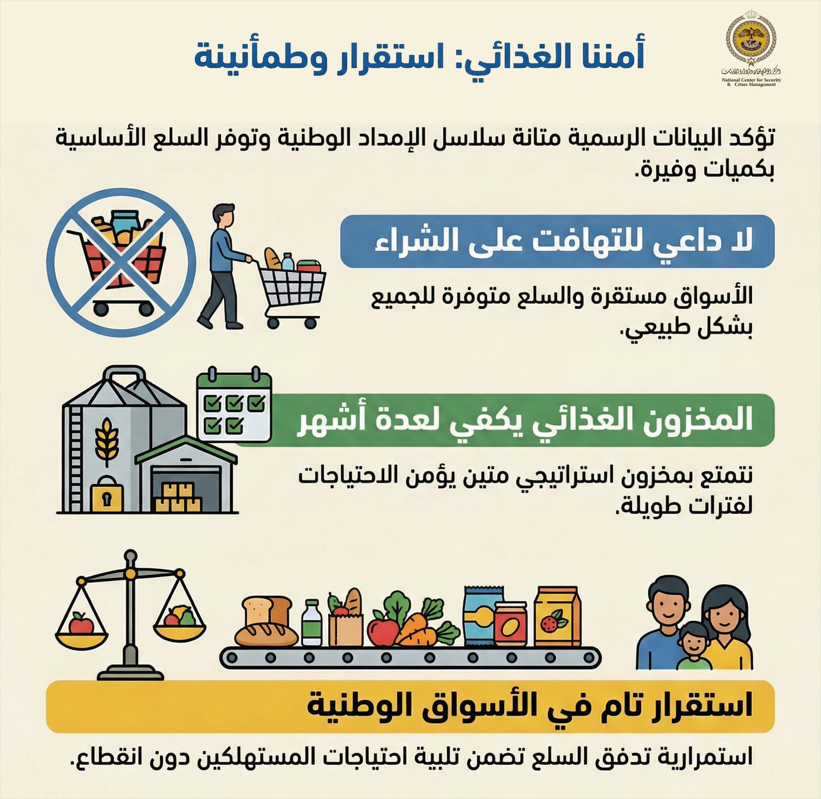 دعا المركز الوطني للأمن وإدارة الأزمات إلى ضرورة الالتزام بالسلوك الشرائي المعتدل وعدم التهافت على شراء السلع، مؤكدا أن الأسواق المحلية تشهد استقرارا في توافر المواد الغذائية الأساسية، وأن المخزون الاستراتيجي يكفي لتلبية احتياجات المملكة لفترات زمنية طويلة.