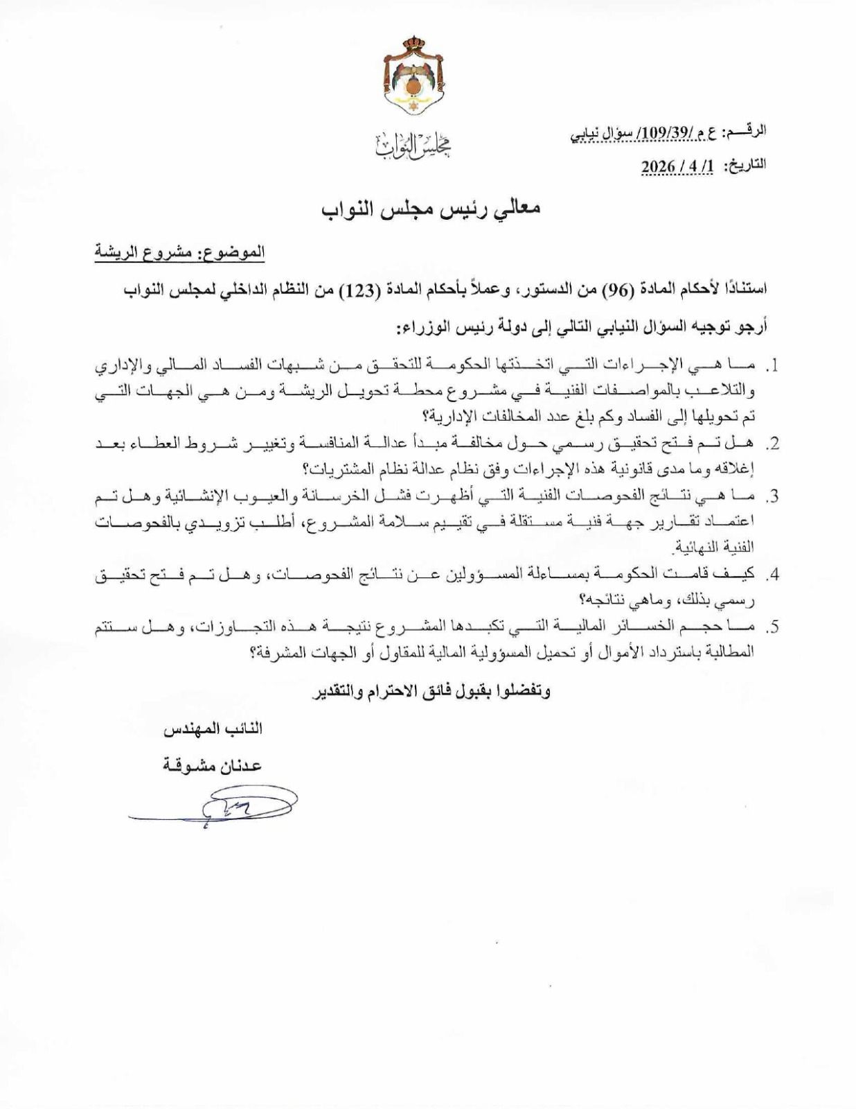 وجّه النائب المهندس عدنان مشوقة سؤالًا نيابيًا إلى رئيس الوزراء، أثار فيه جملة من القضايا المتعلقة بمشروع محطة تحويل الريشة، متسائلًا عن شبهات فساد مالي وإداري، إلى جانب وجود خلل فني في تنفيذ المشروع.