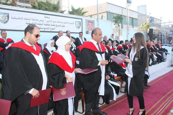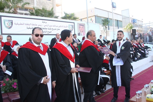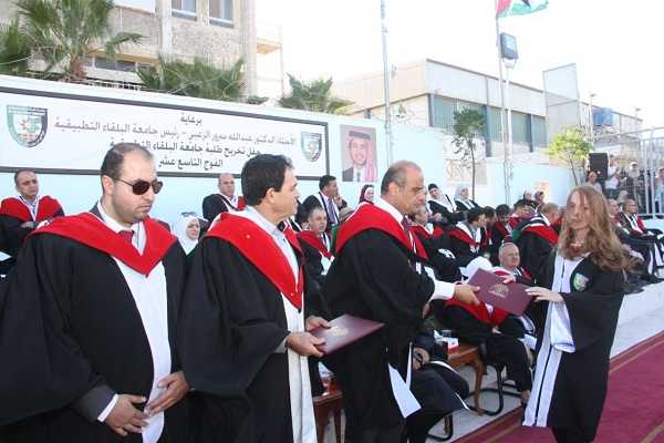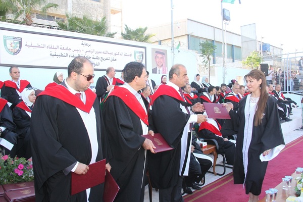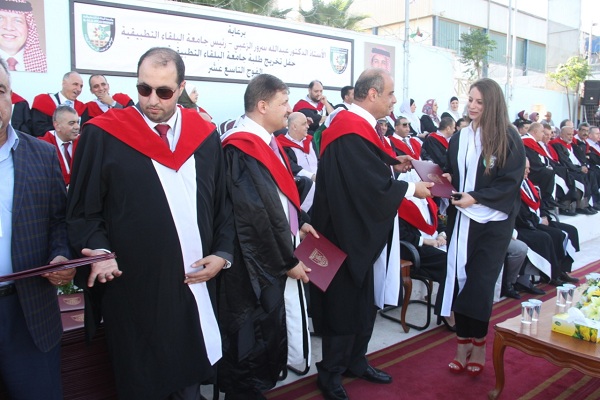 وسلم الاستاذ الدكتور جمال النسور في الحفل الذي اقيم على ملعب الجامعة في السلط وحضره عميد كلية الزراعة التكنولوجية الاستاذ الدكتور سميح ابو بكر وعميد كلية الأمير عبدالله بن غازي للاتصالات وتكنولوجيا المعلومات الدكتور خلف ختاتنه وأعضاء الهيئة التدريسية في الكليات الثلاث وذوو الخريجين سلم الشهادات على الطلبة الخريجين والبالغ عددهم (872) طالبا وطالبة موزعين على كافة التخصصات في الكليات الثلاثة .