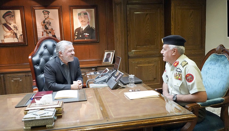 واجتمع جلالة الملك باللواء الركن الطيار الحنيطي فترة من الوقت، تم خلالها بحث عدد من الأمور والقضايا التي تهم القوات المسلحة في مختلف المجالات العملياتية والتدريبية واللوجستية، حيث أكد جلالته اعتزازه بمنتسبي القوات المسلحة الأردنية – الجيش العربي، وما وصلت إليه تشكيلاتها ووحداتها من جاهزية عالية ومستوى متميز. كما أكد جلالة الملك اعتزازه وثقته بالقيادات الحالية للأجهزة الأمنية وبالجهود الكبيرة التي تبذلها الأجهزة الأمنية من أجل الحفاظ على أمن الوطن وصون مقدراته بمهنية واحترافية عالية.