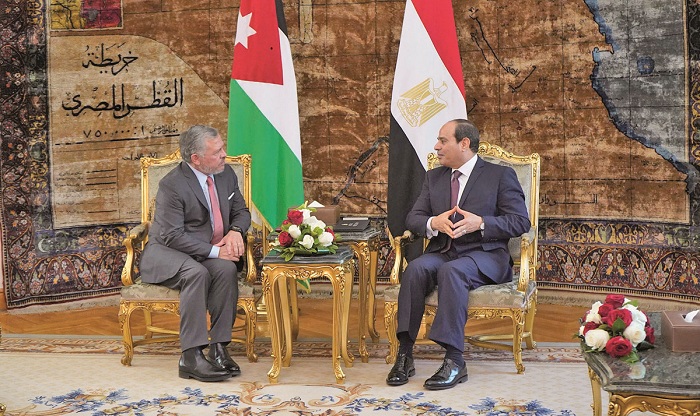 وعلى صعيد التطورات الإقليمية، تصدرت القضية الفلسطينية والقدس المباحثات، حيث أكد جلالة الملك والرئيس المصري ضرورة تحقيق السلام العادل والدائم بين الفلسطينيين والإسرائيليين، والاستمرار بدعم الأشقاء الفلسطينيين لنيل حقوقهم العادلة والمشروعة في إقامة دولتهم المستقلة على خطوط الرابع من حزيران عام 1967، وعاصمتها القدس الشرقية، وفقا لحل الدولتين ومبادرة السلام العربية.