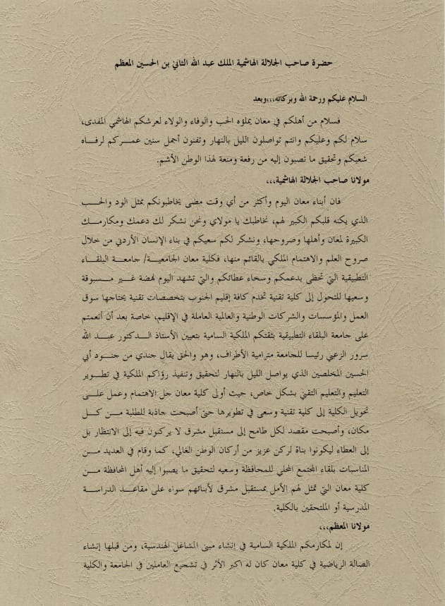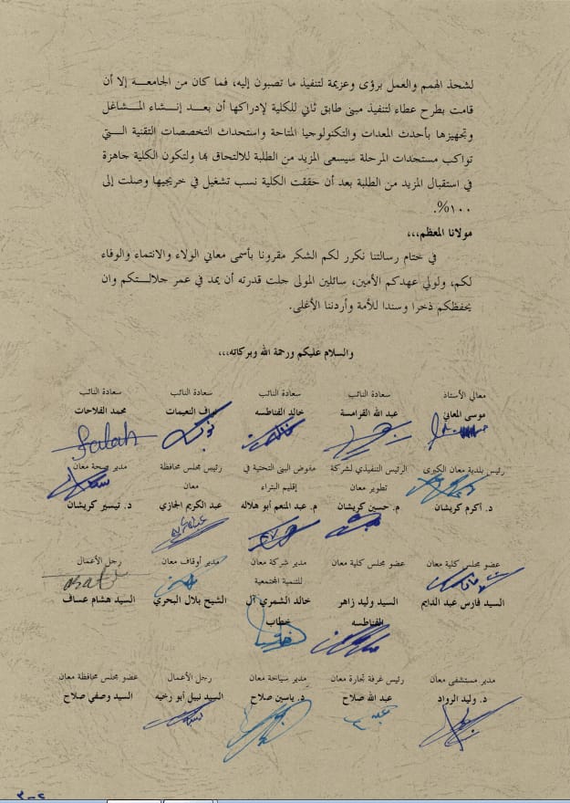 مؤكدين على العطاء والانجاز المتواصل في جامعة البلقاء التطبيقية ورئيسها الذي تعامل بعدالة ومساواة وإنصاف مع كافة الكليات التابعة للجامعة والوقوف معها على قدم واحدة من المساواة والذي اعتمد الأوراق النقاشية التي أطلقتموها جلالتكم كخارطة طريق لجامعة البلقاء التطبيقية فهذه الجامعة التي ثبتت أركانها وتكاملت متطلباتها واحتياجاتها، لتؤدي دورها المنشود في دفع عجلة التنمية في وطننا وما قرار رئاسة الجامعة بتحويل كلية معان الجامعية إلى كلية تقنية والتي حظيت بمكارم ملكية وجملة من المنجزات العمرانية والأكاديمية والتقنية والتي حققتها الكلية كالبنية التحتية ومختلف المشاريع التي تم انجازها هي بفضل اهتمامكم ودعمكم يا مولانا.