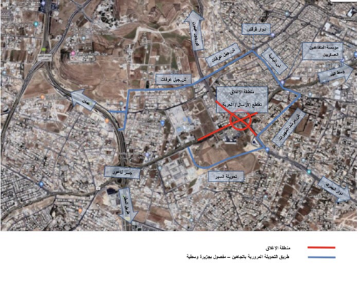 وقررت الوزارة تحويل السير للقادم من تقاطع جسر ناعور باتجاه "شارع القدس وشارع الحرية "،بحيث يسلك التحويلة بعد الأمن العام على اليمين، والقادم من شارع القدس باتجاه جسر ناعور وطريق المطار يسلك شارع البادية بجانب محطة الإرسال للمحروقات باتجاه دوار قرقش ثم شارع جبل عرفات إلى نفق الصحابة وحسب الإرشادات والشواخص المرورية .