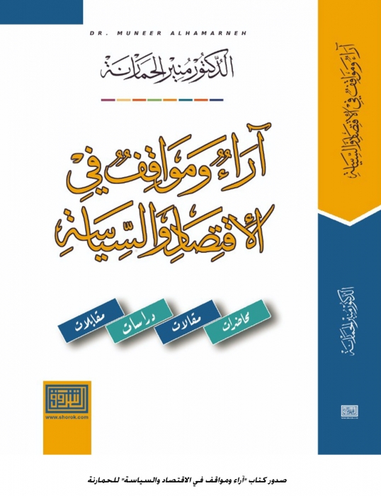 صدر حديثا كتاب بعنوان "آراء ومواقف في الاقتصاد والسياسة- محاضرات، مقالات، دراسات، مقابلات"، للدكتور منير الحمارنة،عن دار الشروق للنشر والتوزيع، عمان- الاردن، رام الله- فلسطين.