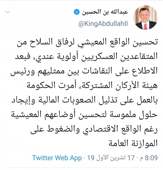 غرد جلالة الملك عبدالله الثاني بن الحسين عبر صفحته الشخصية على موقع تويتر قائلا: