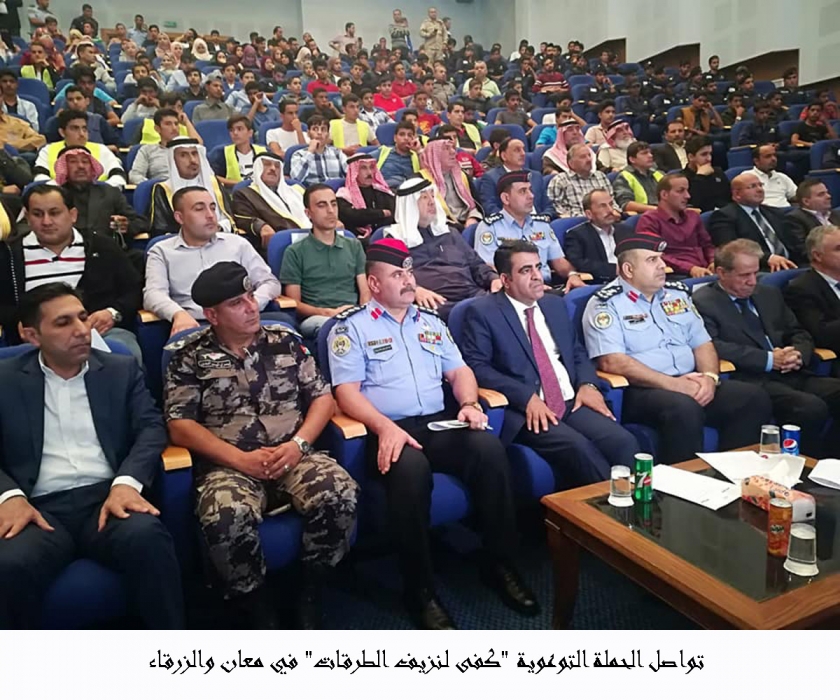 وفي محافظة الزرقاء انطلقت مديرية شرطة لواء الرصيفة بالتعاون مع المجتمع المحلي الحملة التوعوية "كفى لنزيف الطرقات" حملت شعار "السلامة المرورية: مسؤولية الجميع "، وذلك في كلية رفيدة الأسلمية للتمريض .