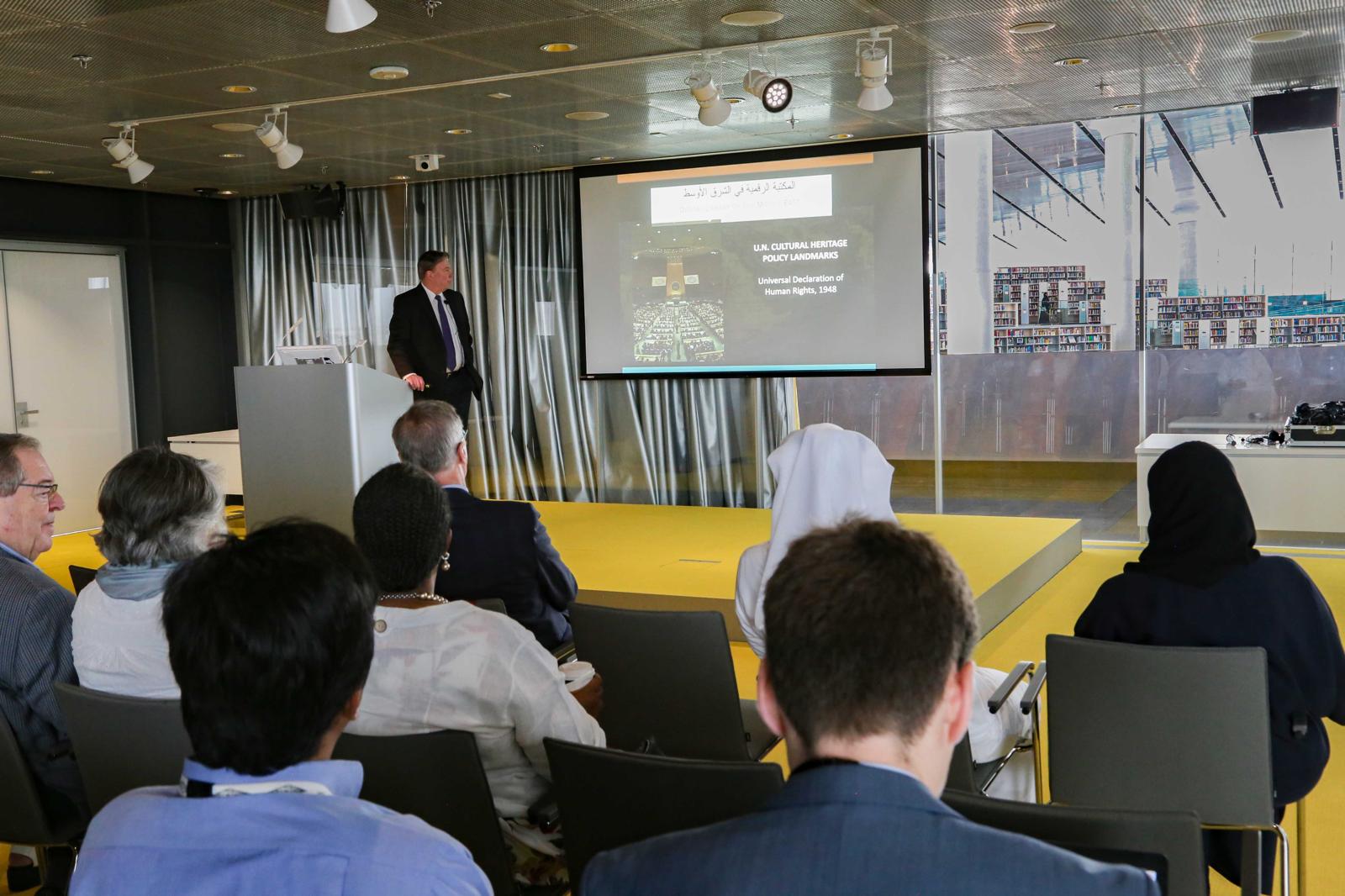 تناولت محاضرة في مكتبة قطر الوطنية في 30 أكتوبر أهمية المواقع الإلكترونية الأرشيفية ذات التكنولوجيا المتطورة مثل مكتبة الشرق الأوسط الرقمية ودورها في إتاحة المعلومات التاريخية والتراثية على نطاق واسع، وحفظ التراث ومعلومات الآثار التاريخية لأجيال المستقبل.