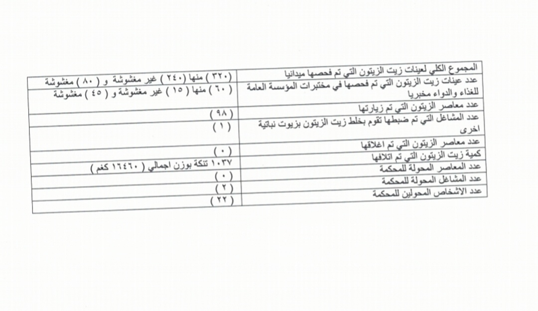 ضبطت كوادر المؤسسة العامة للغذاء والدواء وبالتعاون مع الجهات الأمنية والحاكمية الإدارية في مختلف محافظات المملكة نحو 1037 تنكة زيت زيتون مغشوش وبكمية تقديرية وصلت الى 16460 كيلوغرام وذلك منذ بدء الموسم .