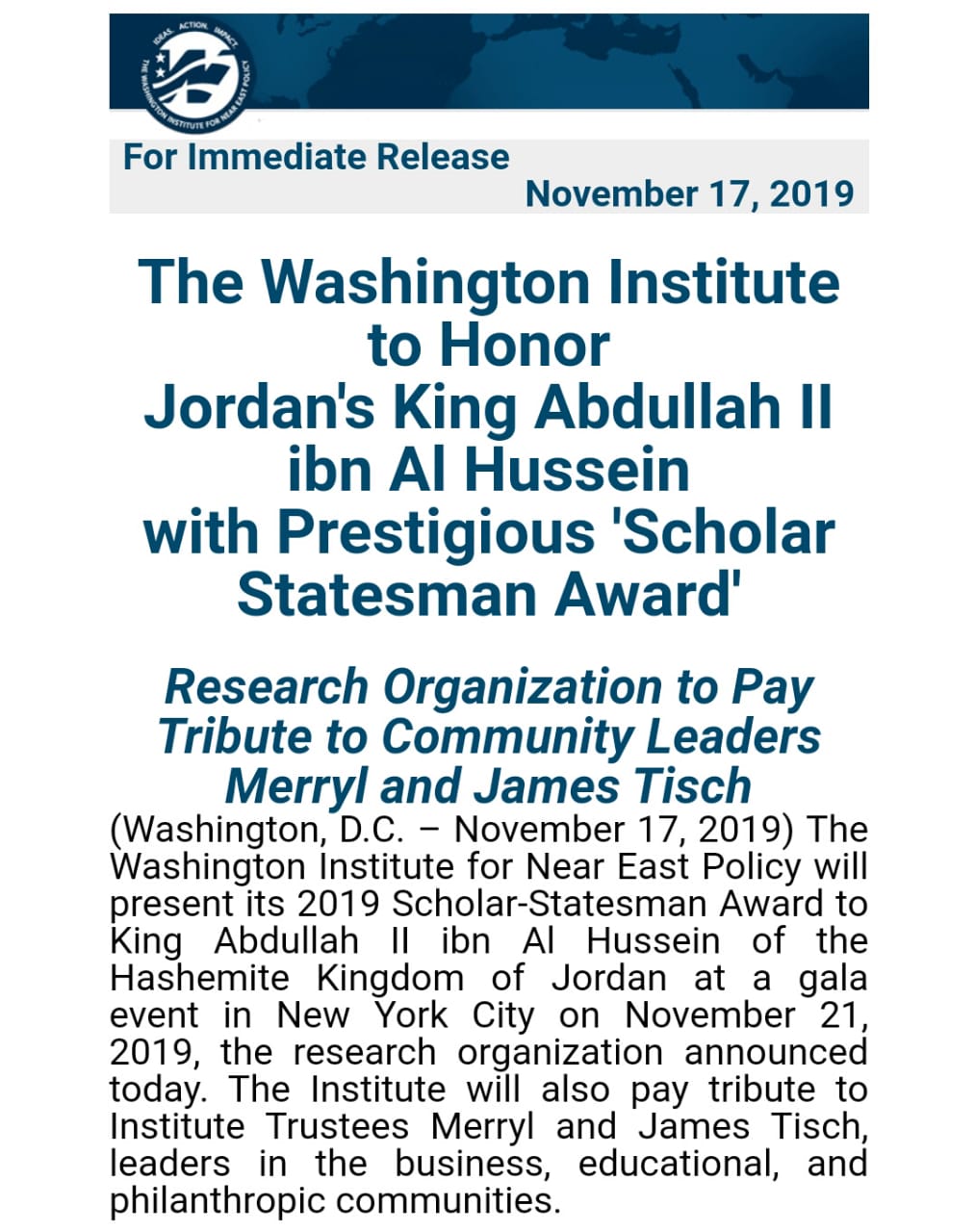 سيقدم معهد واشنطن لسياسة الشرق الأدنى جائزته لعام 2019 للعلماء للملك عبد الله الثاني بن الحسين من المملكة الأردنية الهاشمية في حفل أقيم في مدينة نيويورك في 21 نوفمبر ، 2019 ، أعلنت منظمة البحوث اليوم. سيشيد المعهد أيضًا بأمناء المعهد Merryl و James Tisch ، قادة المجتمعات التجارية والتعليمية والخيرية.