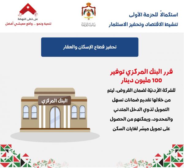 أعلن رئيس الوزراء الدكتور عمر الرزاز أن الشركة الأردنية لضمان القروض، ستوجه 100 مليون دينار للبنوك لدعم الأسر التي تسعى إلى الحصول على سكن.