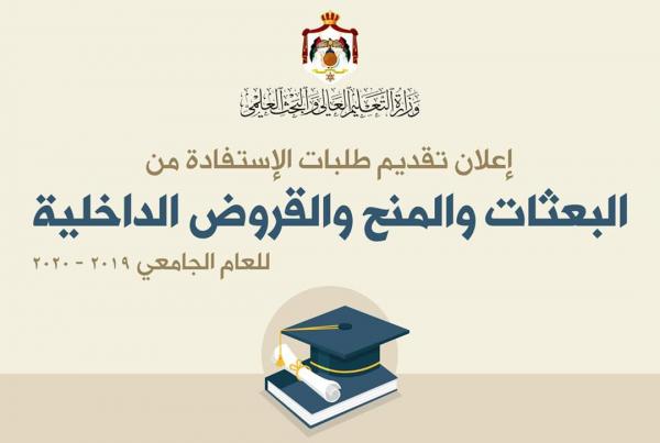 تعلن وزارة التعليم العالي والبحث العلمي للطلبة الأردنيين الملتحقين في الجامعات الأردنية الرسمية ضمن البرنامج العادي لمستوى درجة البكالوريوس والدبلوم المتوسط عن بدء التقدم بطلبات الاستفادة من البعثات والمنح والقروض للعام الجامعي 2019/2020 والتي يتم تنفيذها من خلال الوزارة اعتباراً من صباح يوم الثلاثاء الموافق 19/11/2019 وحتى الساعة الثانية عشرة ليلاً يوم الخميس الموافق 28/11/2019.