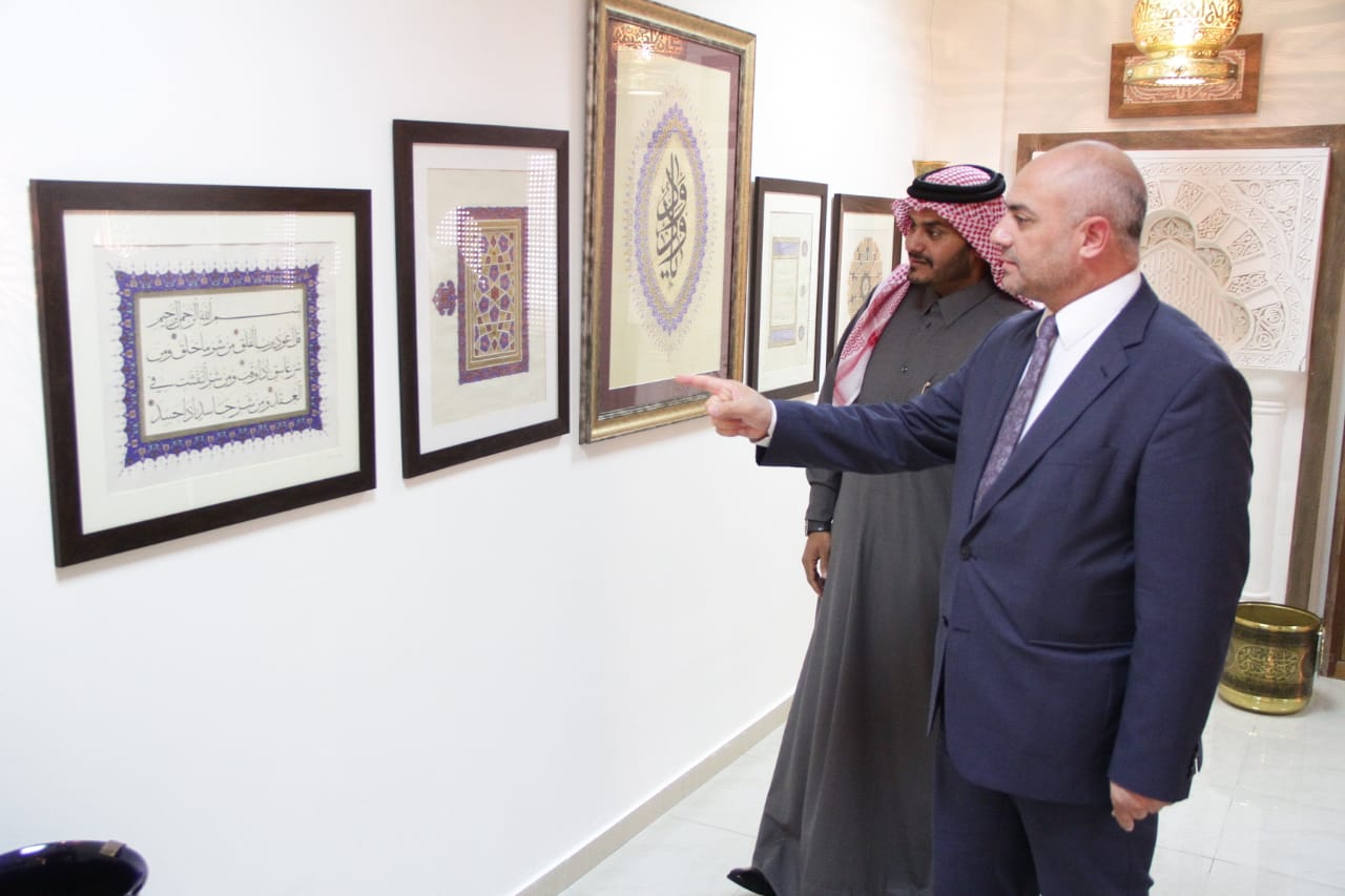 وفي نهاية الزيارة اطلع الملحق الثقافي على بعض الأعمال في معرض الجامعة، والتي تتضمن لوحات من الزخرفة الإسلامية.