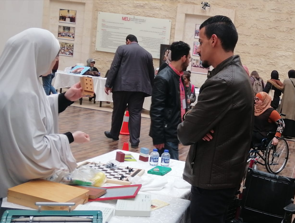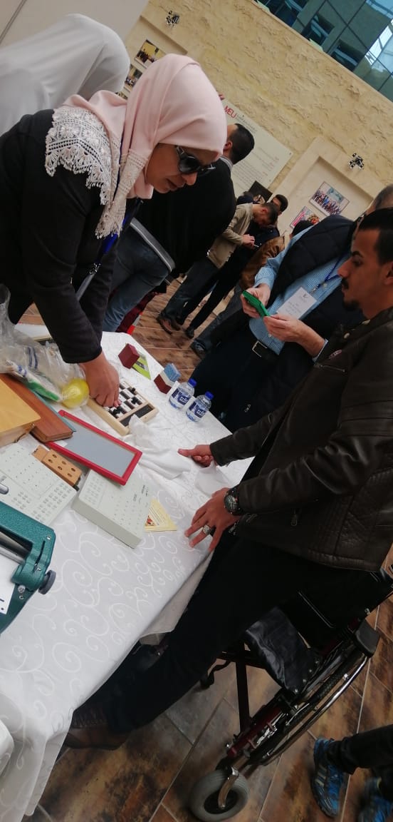 ضمن نشاطات المركز الخاصة باليوم العالمي للأشخاص ذوي الإعاقة والذي يصادف 3/12 من كل عام ، شارك المركز السعودي لتأهيل و تدريب الكفيفات بالأردن ممثلا بمديرته الأستاذة إيناس الطائفي يرافقها مسؤولة العلاقات العامةومجموعة من معلمات وطالبات المركز في فعاليات المبادرةالتي نظمتها لجنة مبادرة ( أردن بلا عوائق ) في جامعة الشرق الأوسط ، حيث قدم معلمات المركز شرح تفصيلي لطلاب وطالبات الجامعة حول (كيفية الكتابة بطريقة برايل - التعريف بأهمية العصا البيضاء وأنواعها وكيفية استخدامها) بالإضافة للتعريف بفن اتيكيت التعامل مع المكفوفين وفن الحركة والتنقل ،